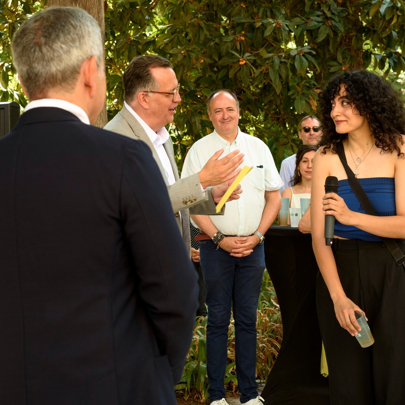 En 2025, remise du Prix de la Fondation du MO.CO. à Melika Sadeghzadeh, par Alex Larue, Président, et Thierry Aznar, Fondateur associé et Vice-président.